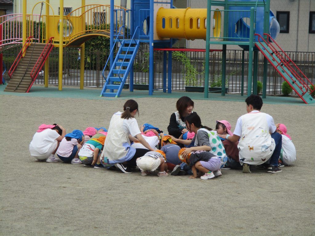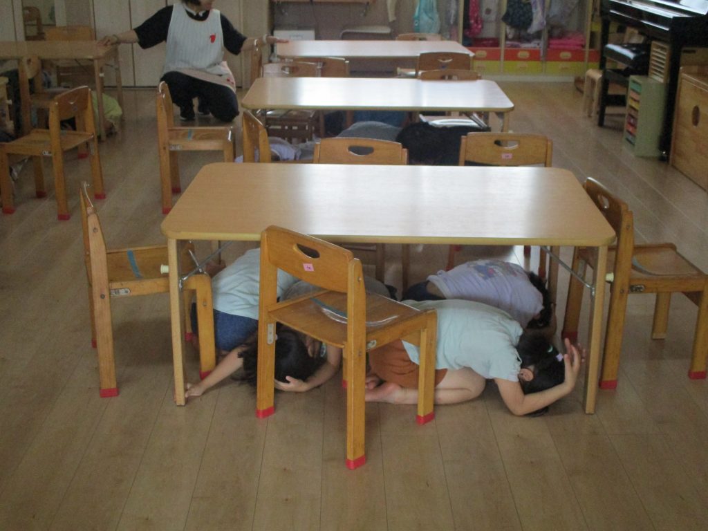 8月4日、地震訓練を実施しました。園庭で遊んでいたお友だちは、先生の指示に従い、速やかに園庭中心で頭を守る大勢をとることができました。室内遊びのお友だちは机の下に速やかに隠れ、身の安全を守ることができました。その後の放送もしっかり聞き取り、防災頭巾をかぶりながら全園児園庭へ移動し、地震の際の動きをみんなで確認することができました。 お喋りすることもなく、静かに真剣に訓練を行うことができていました。